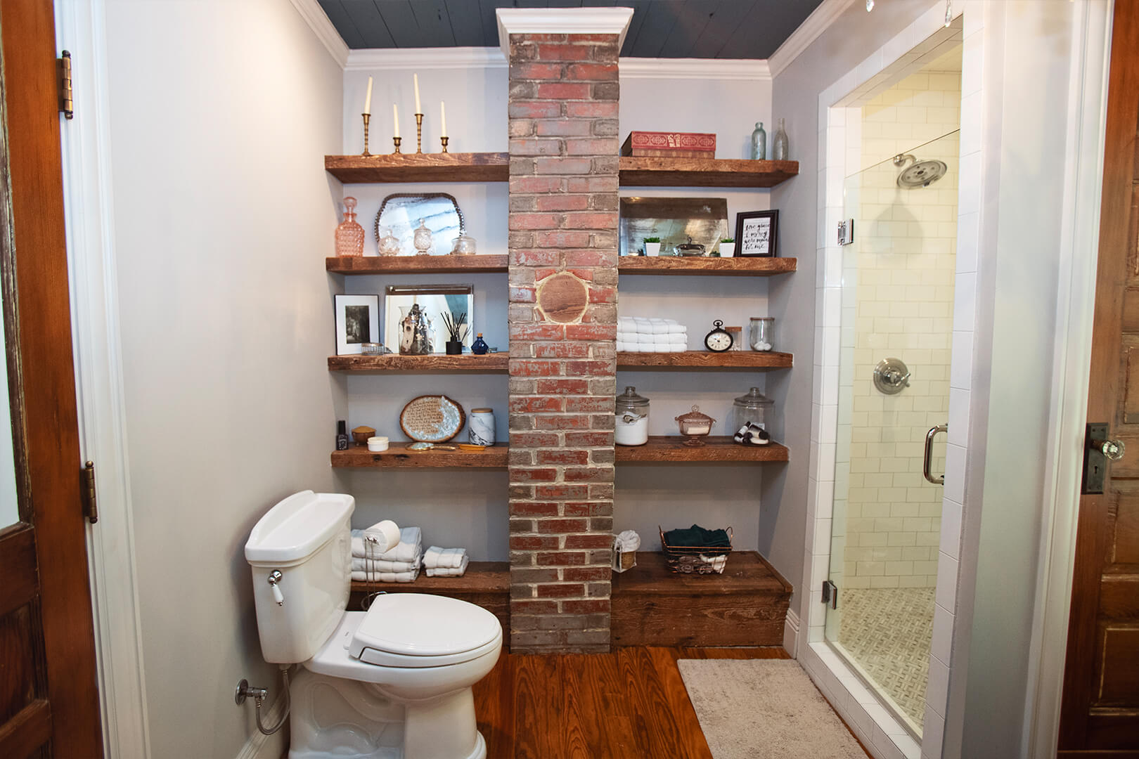 Trena hung one of her salvaged antique doors on a portion of the bathroom wall facing the antique tub she had refinished. She cut a wide antique solid wood cypress door in half and used it on two sides of the kitchen island. Another salvaged door is used for a pocket door -- the perfect solution to streamlining space. Trena noted her appreciation of these one-of-a-kind doors, crafted for openings of all sizes rather than mass-produced, standardized doors.