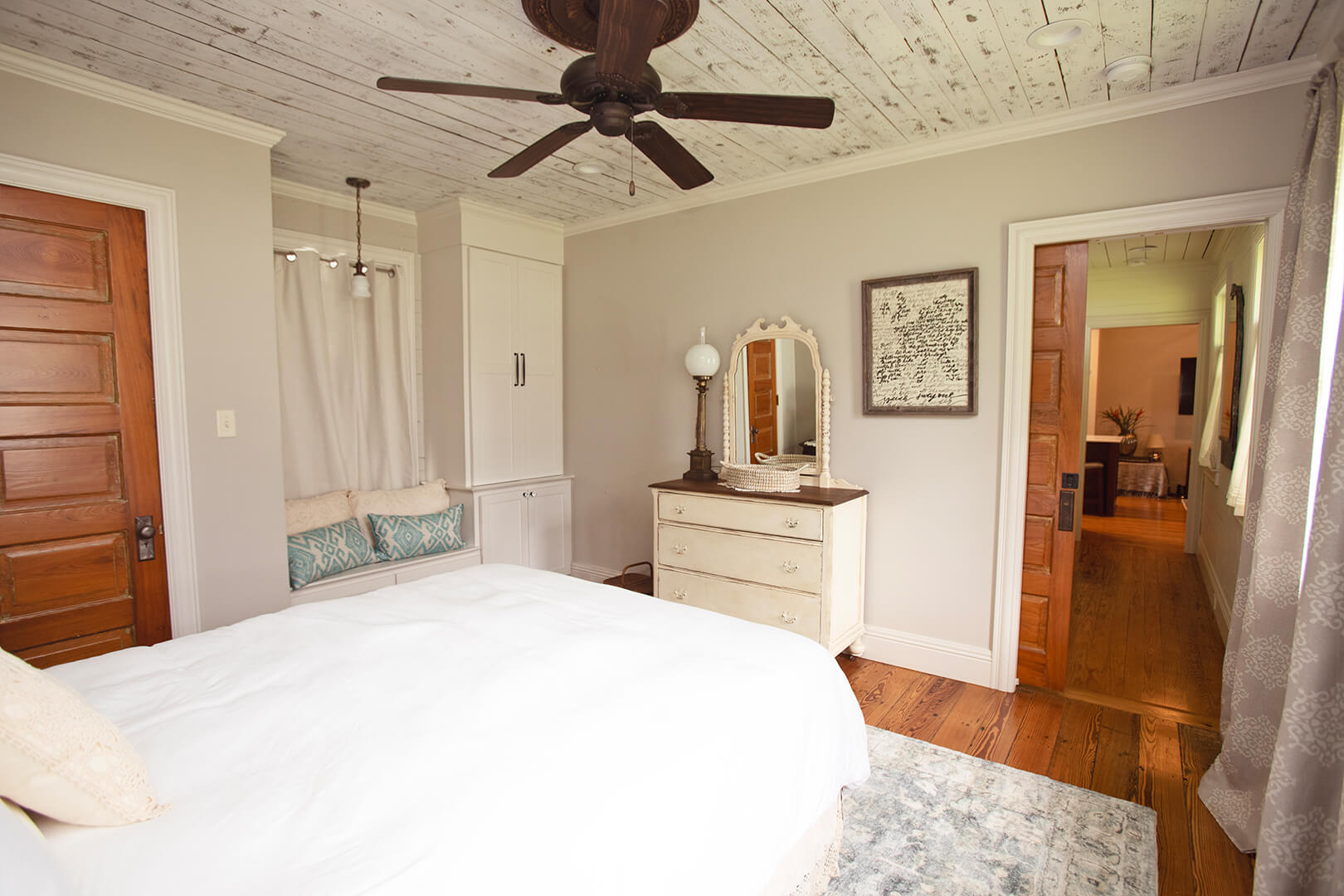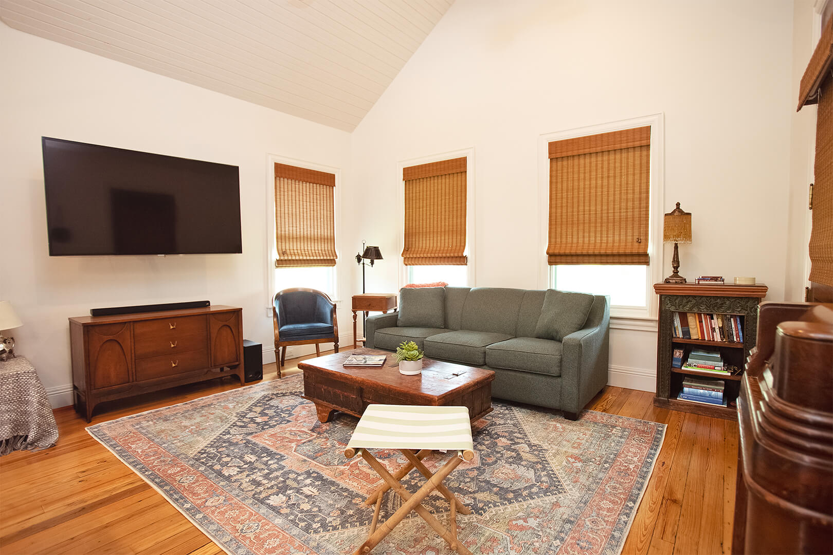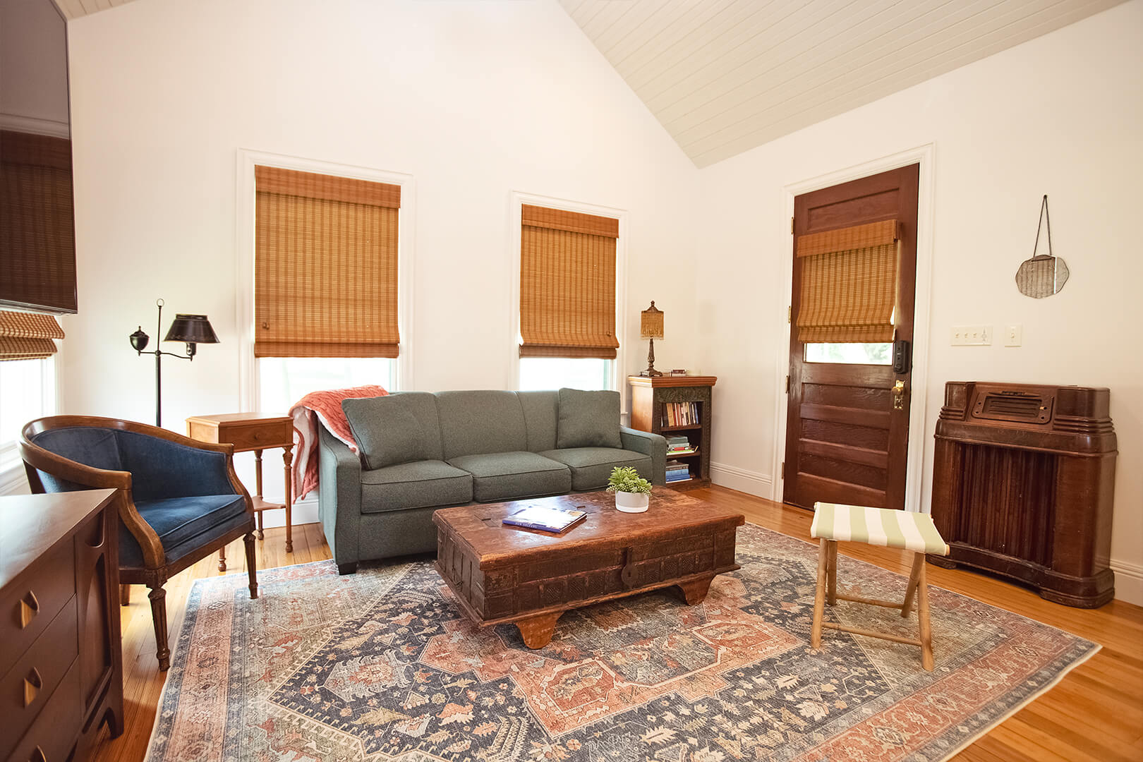 The existing bargeboard that covered interior walls was brought back to life with a fresh coat of white paint. It doesn’t cover up what it was. It brightens it. Peeling away the old, dirty, indoor/outdoor carpet revealed a solid wood floor pocked by powder dust beetles in the oldest portion of the structure. With a little polish and attention, the scars make the floor more interesting as well as attractive.