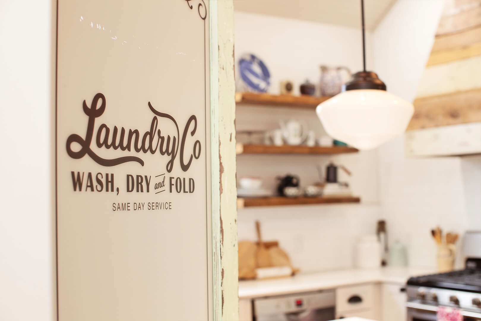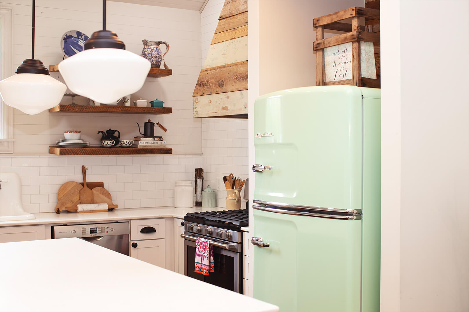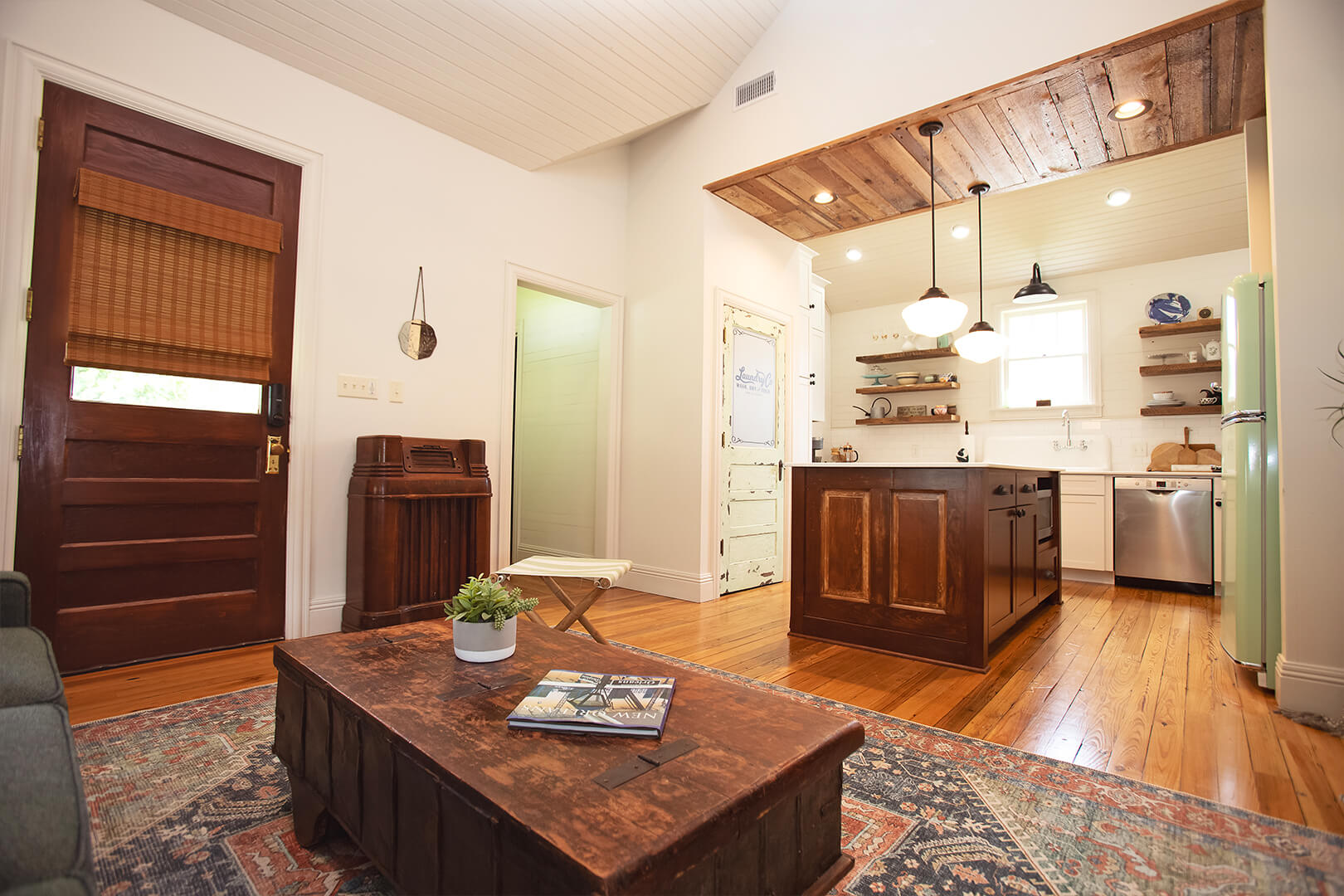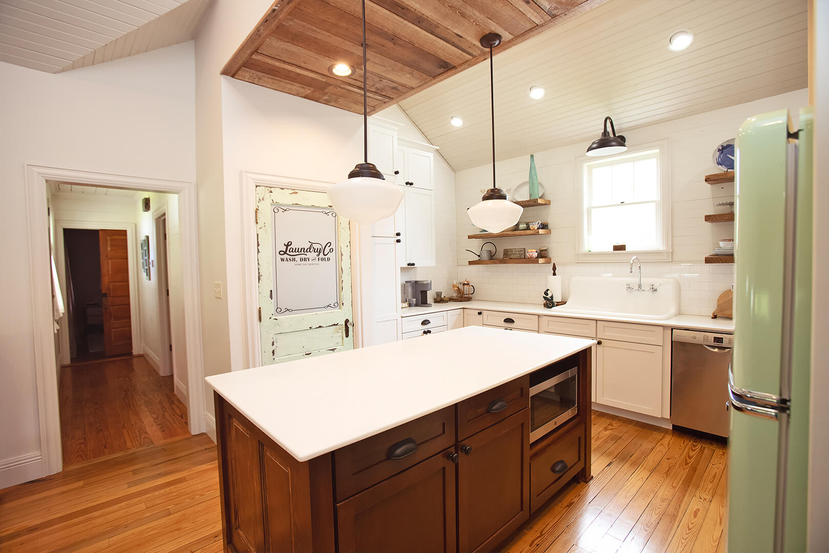 The washer and dryer nook is accessed through a salvaged door that has been distressed with light, bluish green paint and other colors. Trena found inspiration from Pinterest and a detailed, talented craftsperson in Blaire Derouen, Flippin’ Fabulous, to execute the look. The same treatment was used on the old bathroom mirror that now hangs in the hall. After her daughter Isabella showed Trena a photo of a retro fridge in the same color, Trena rearranged the kitchen layout opposite the washer/dryer door to make Isabella’s find a focal point.