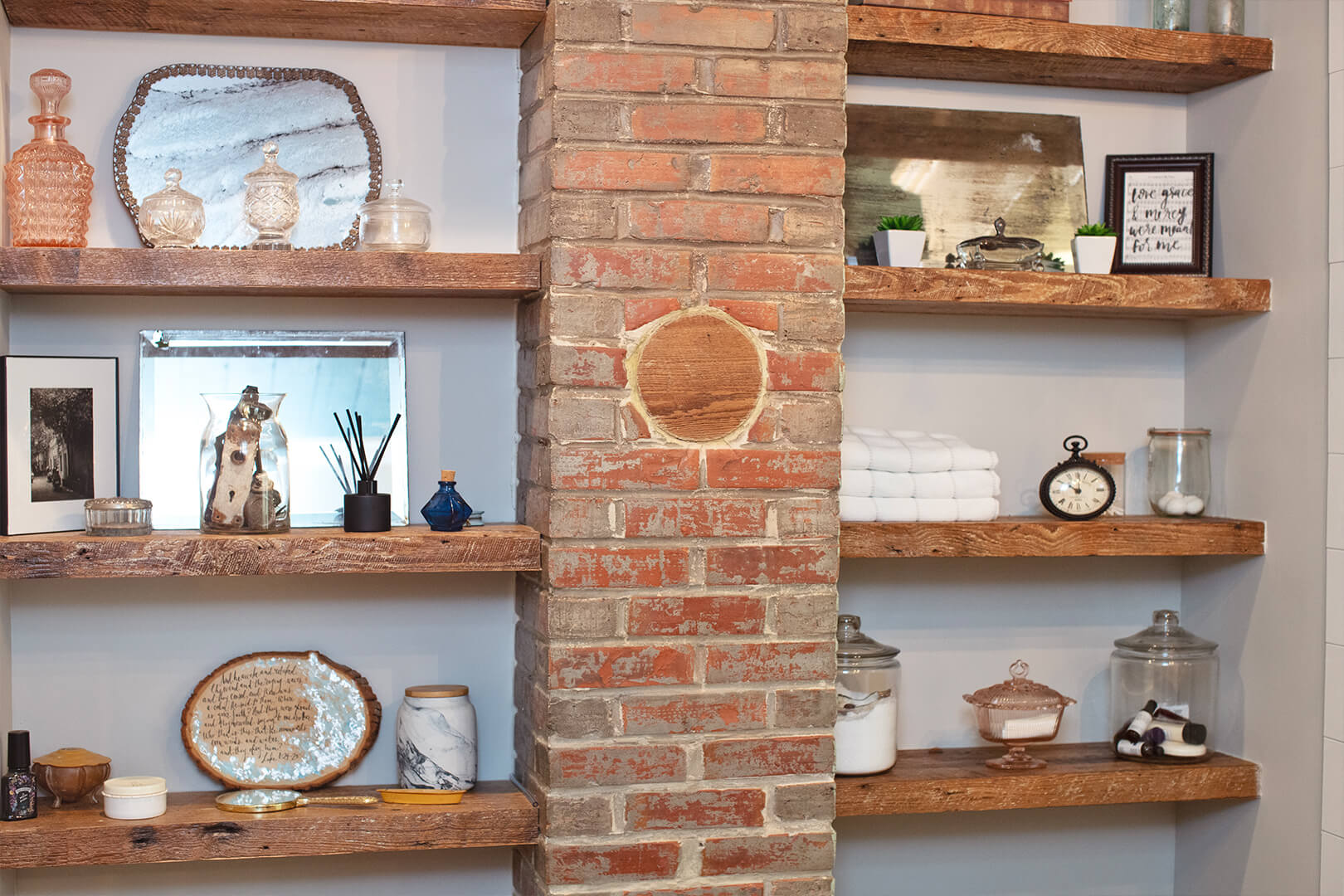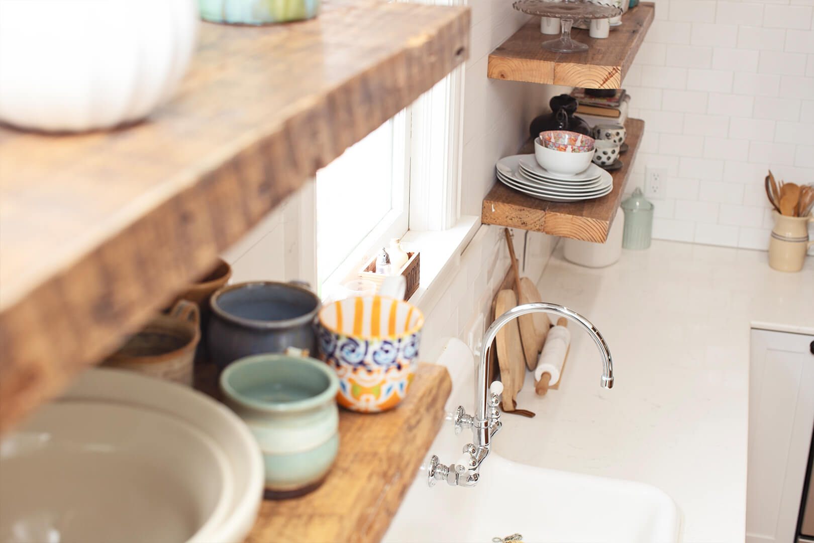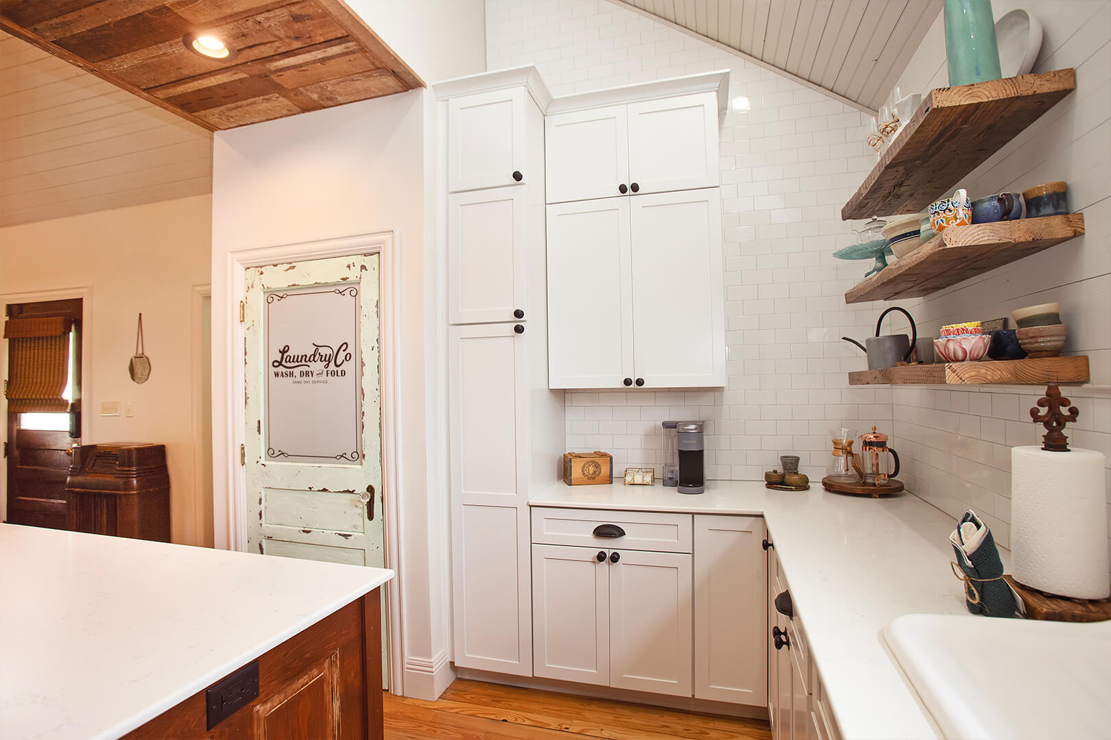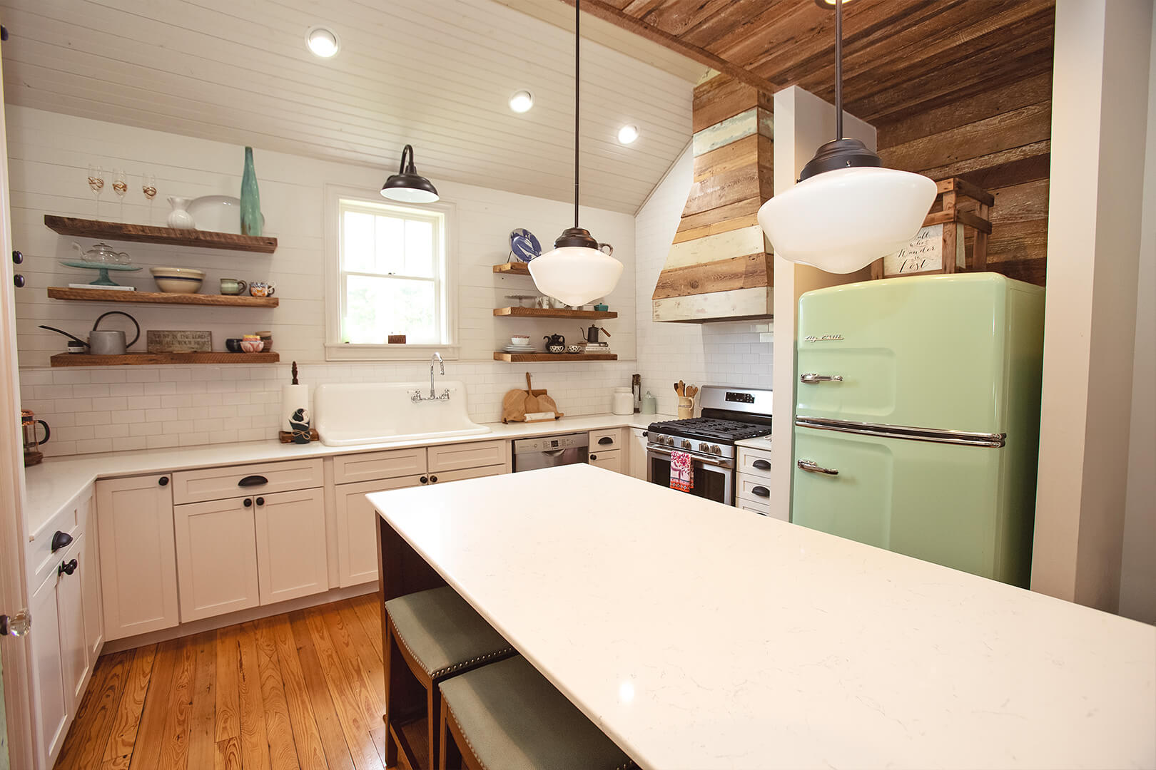Trena used the native long leaf pine barn siding, pulled from the exterior of the structure, to cover the air conditioner run and create a range vent hood. Damaged sills were used to create floating shelves that now support an interesting assortment of memories and dishes: pottery from Candice Alexander before shebecame a popular local artist; dishes from her daughter who moved abroad; and a pottery dish left behind by friends; and a few things from Trena’s own collection.